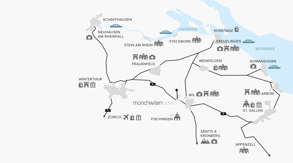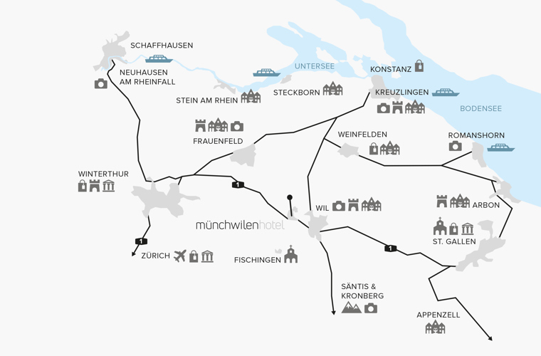 The Hotel Münchwilen is ideally located for making the most beautiful excursions in the region, visiting sights, strolling through old towns, shopping or simply enjoying nature.