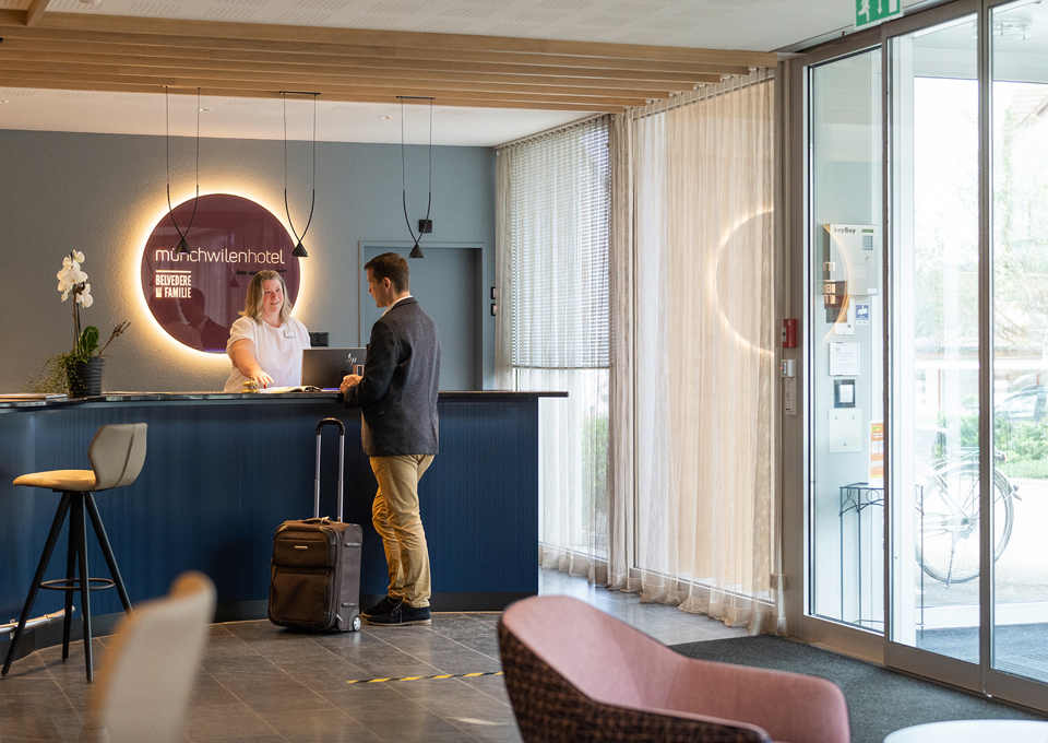 Im Hotel Münchwilen profitieren Sie von persönlichem Service direkt vor Ort. Die geräumigen Zimmer (24m2) mit Schreibtisch sind ideal um sich auf die Geschäftstermine vorzubereiten. Unser Conciergedienst organisiert für Sie Ihr Taxi zur gewünschten Zeit, kümmert sich um Ihre Wäsche oder gibt Ihnen gerne Restaurant- und Ausflugstipps für die Region.